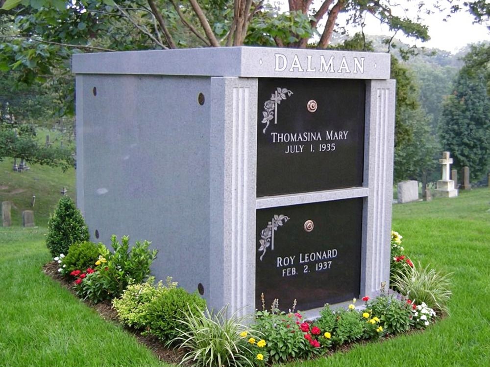 The starting price for a two crypt mausoleum similar to the one shown is about $50,000* installed. Prices may vary due to the granite color and design elements selected.